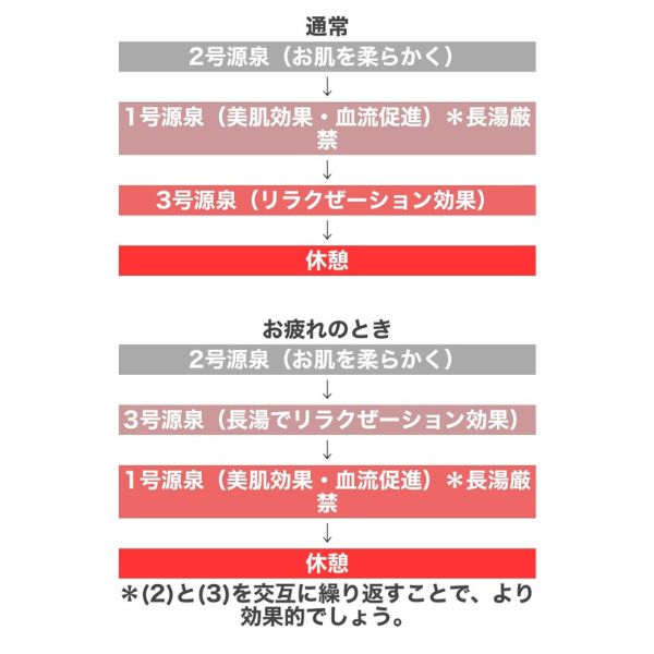 「多宝温泉だいろの湯」では、公式サイトでは、それぞれの源泉の良さを生かしたおすすめの入浴法を紹介しているためぜひ試してほしい。