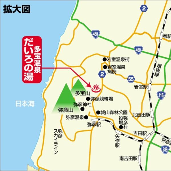 ・北陸道・巻潟東I.C→国道460号線→国道116号線→ 県道55号線(新潟五泉間瀬線)→岩室→県道2号線(新潟寺泊線)→だいろの湯